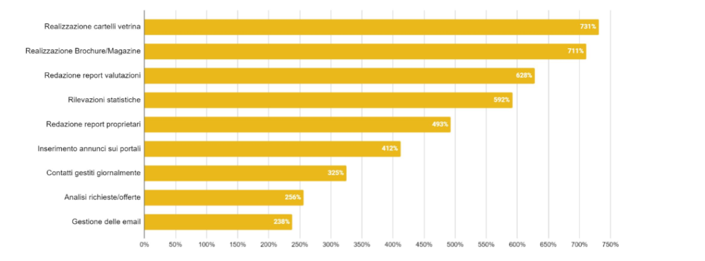 La “Rilevazione delle migliorie di processo” condotta su un campione di agenti immobiliari che utilizza Agim Gestionale immobiliare nel proprio flusso di lavoro mostra incrementi dichiarati che rendono l’idea dell’impatto operativo: